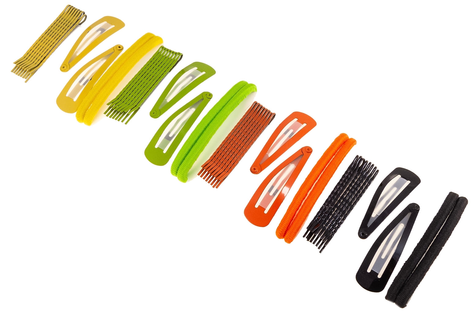 Zestaw składający się z klasycznych spinek, gumek i wsuwek.Zestaw składa się z czterech kolorów: żółty, zielony, pomarańczowy i czarny.