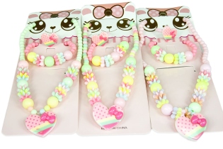 Komplet biżuterii dziecięcej, składający się z naszyjnika, bransoletki i pierścionka.