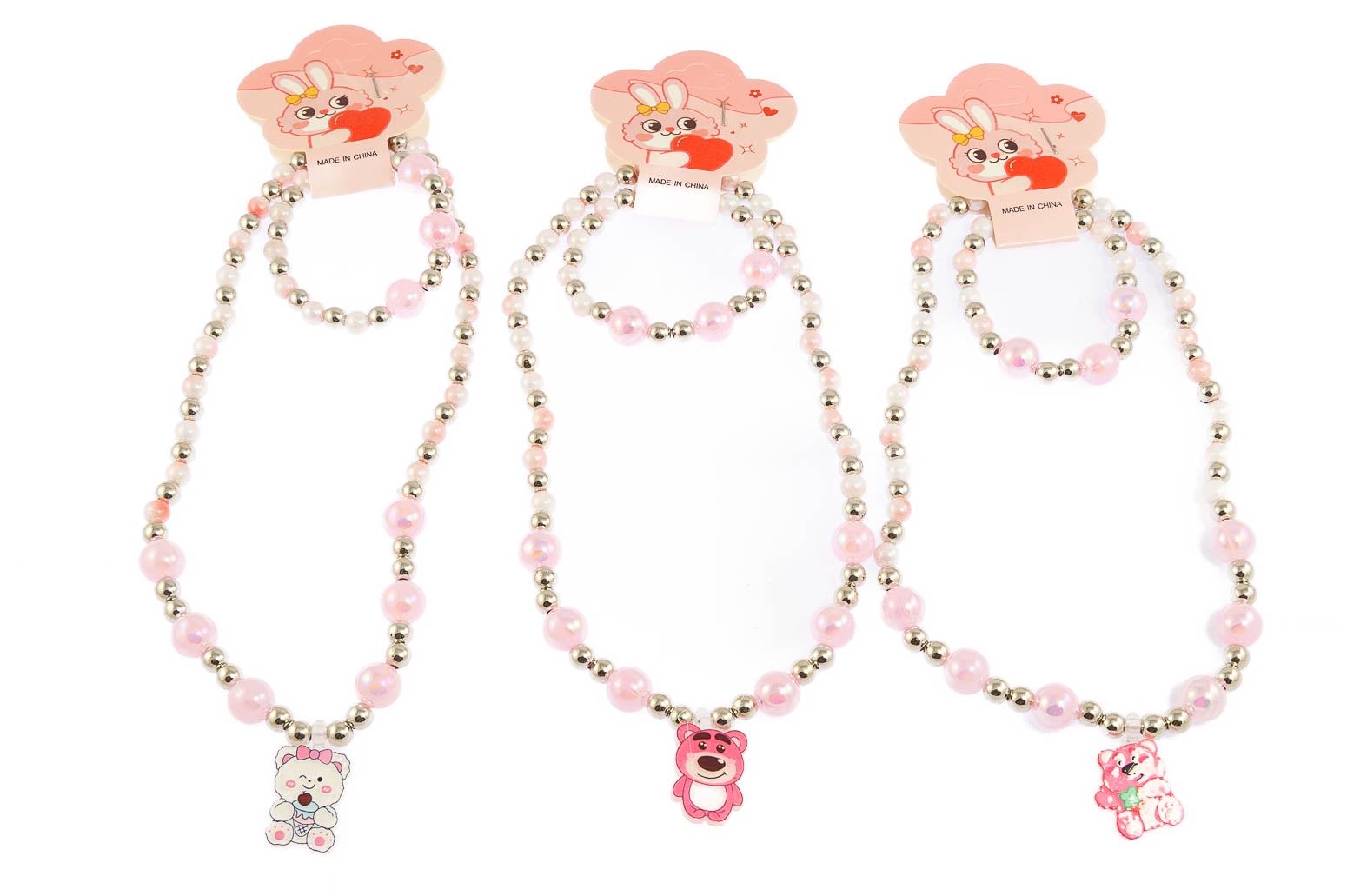 Komplet biżuterii dziecięcej, składający się z naszyjnika i bransoletki.Biżuteria wykonana z perełek i uroczej przywieszki w kształcie misia.