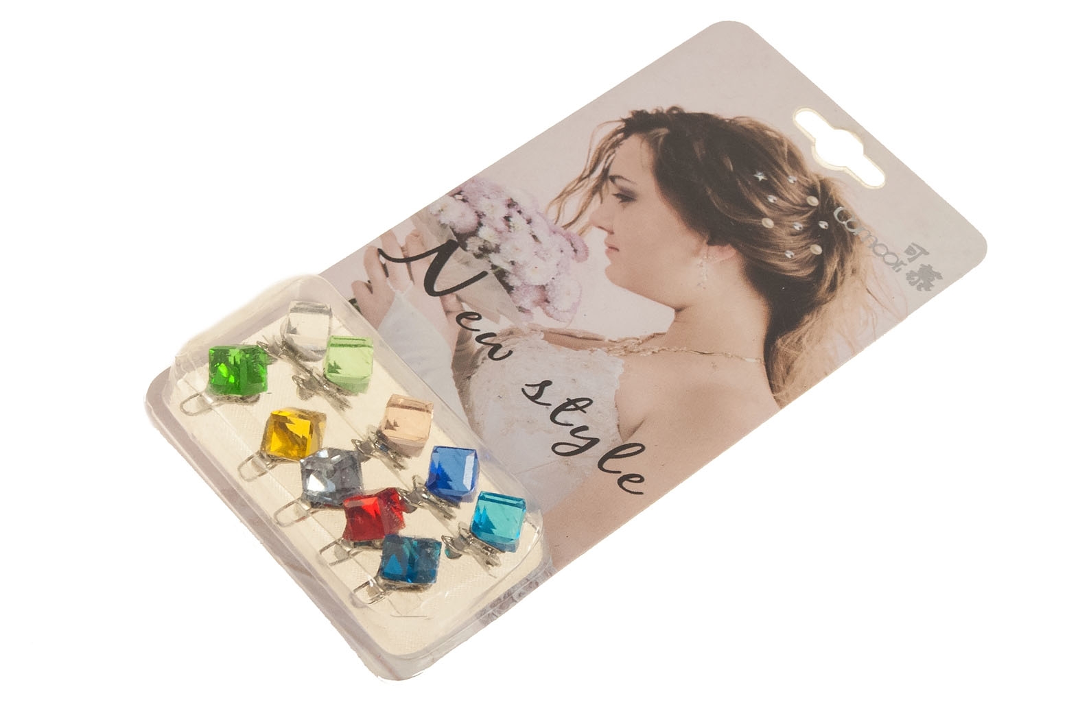 Małe spineczki w kstałcie kostek. Spinki dodadzą elegancji upiętej fryzurze.Zestaw składa się z dziesięciu kolorowych spinek.