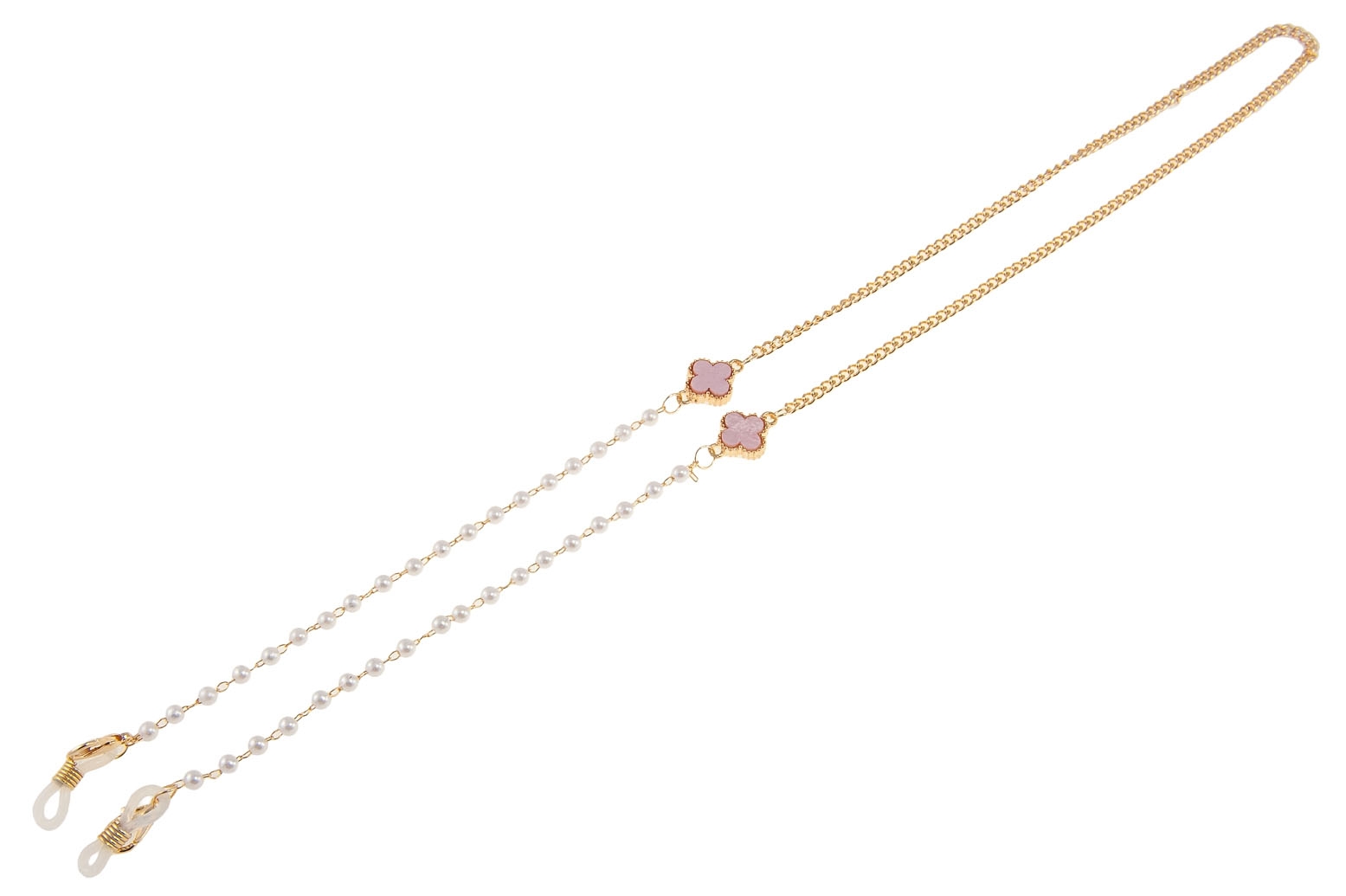 Łańcuszek w kolorze złotym ozdobiony emaliowanym, różowym kwiatkiem i perełkami.