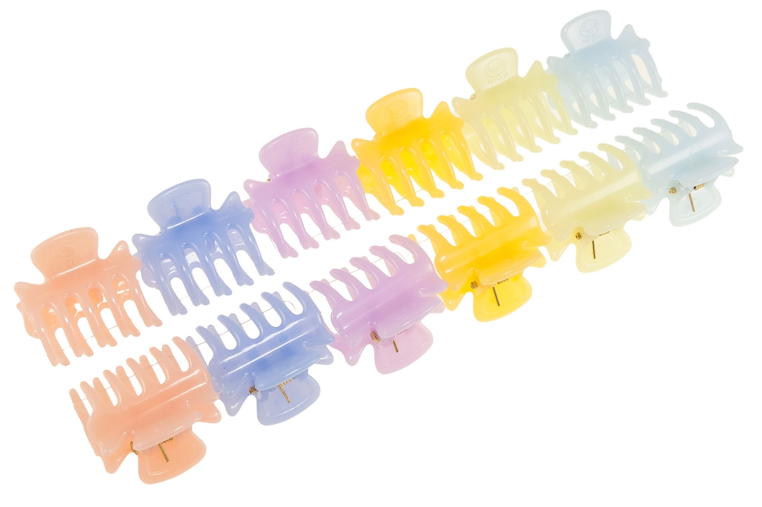 Małe spinki do włosów w sześciu pastelowych kolorach: żółty, beżowy, fioletowy, błękitny, niebieski i różowy