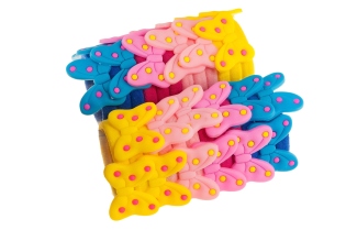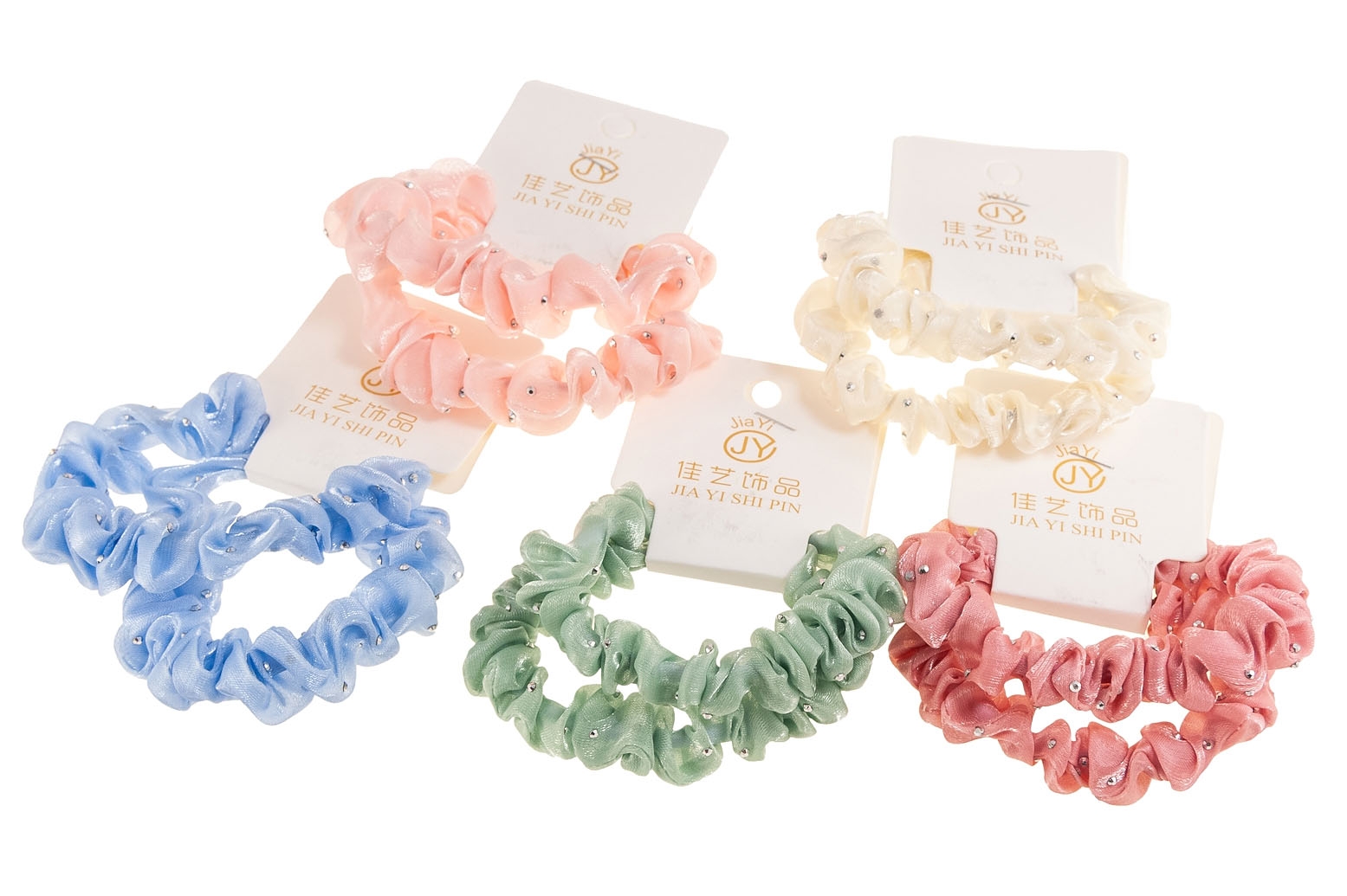 Eleganckie gumki do włosów, są wytrzymałe i dobrze trzymają włosy. Gumki pokryte są materiałem i ozdobine dżetami.Zestaw składa się z pięciu kolorów: biały, zielony, niebieski, jasny i ciemny różowy.