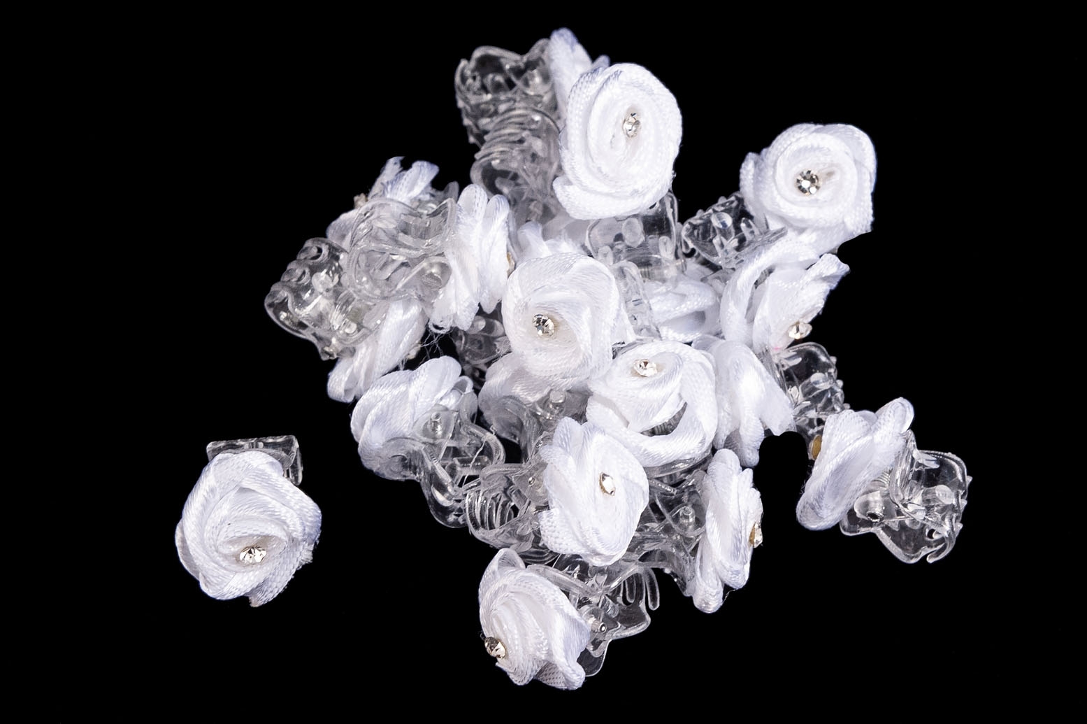Transparentne miniszczęki ozdobione białą różyczką z dżetem.