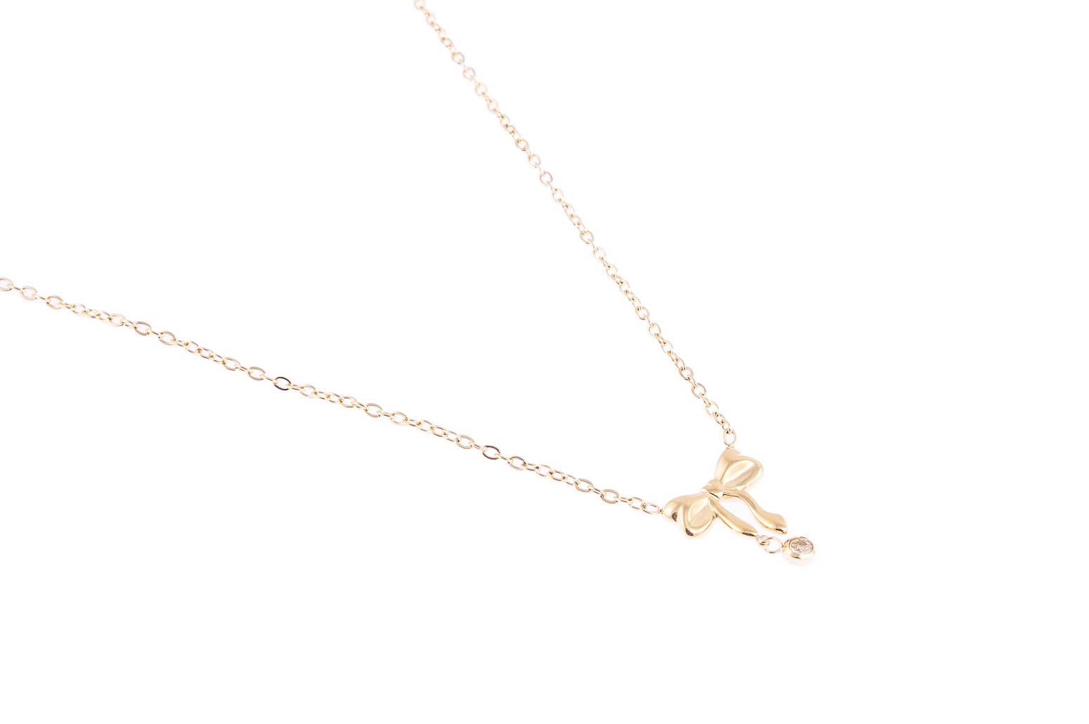 Elegancki łańcuszek z uroczą przywieszką w kształcie kokardki. Naszyjnik jest w kolorze złotym.Wymiary naszyjnika: