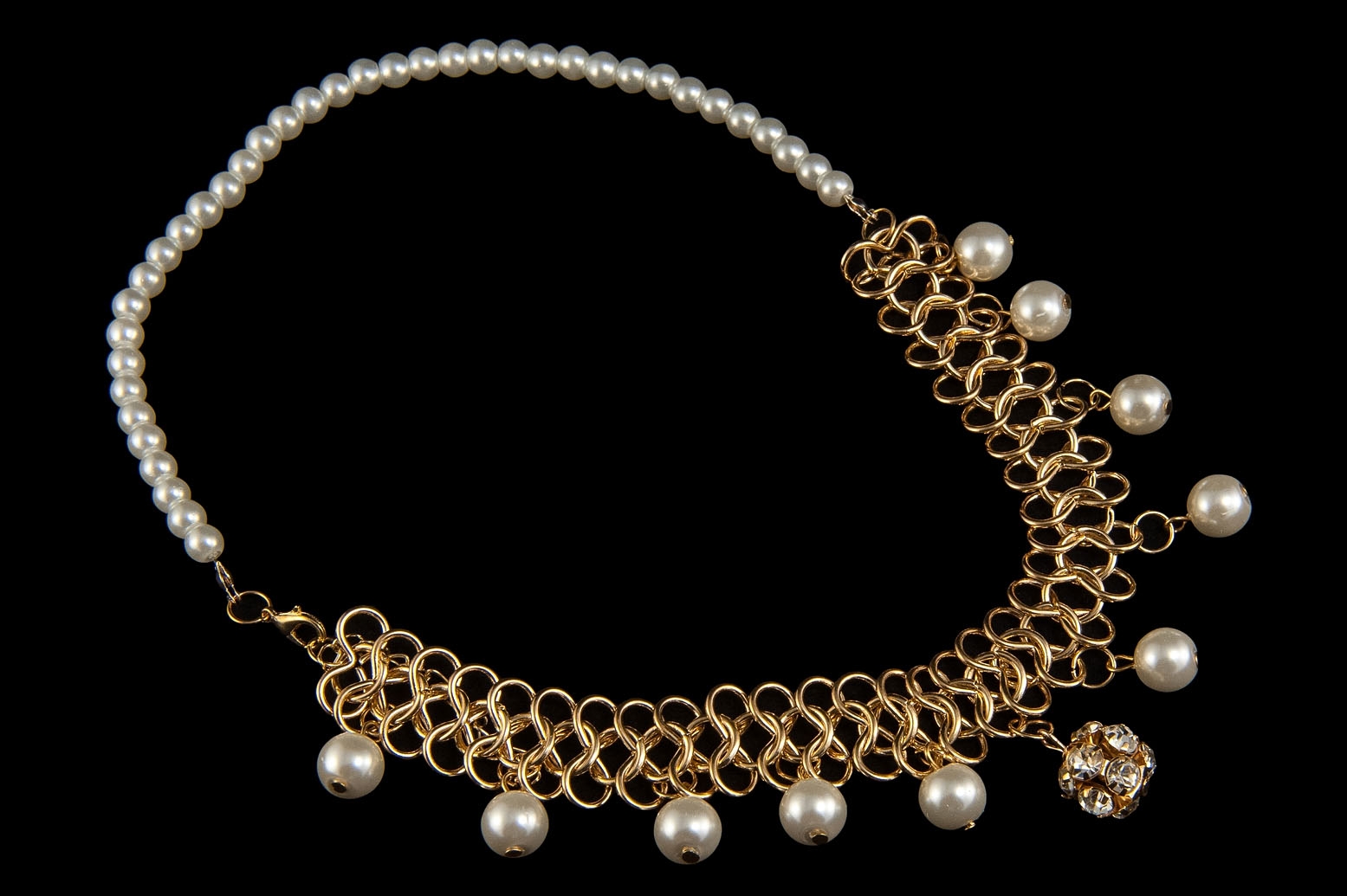 Eleganckie naszyjnik.Naszyjnik składa się z białych pereł i złotego łańcucha.