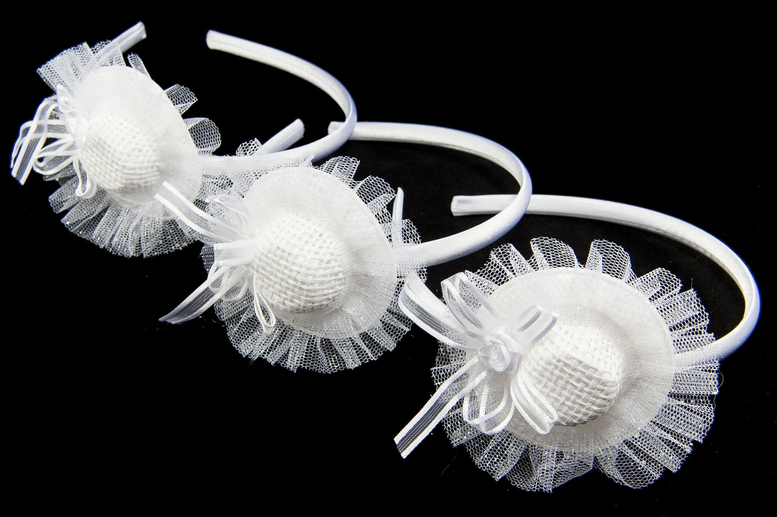 Białe opaski do włosów z ozdobą w kształcie kapelusza z wstążką.