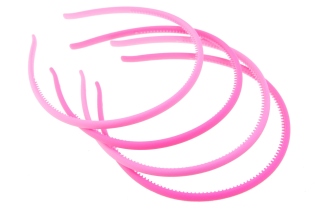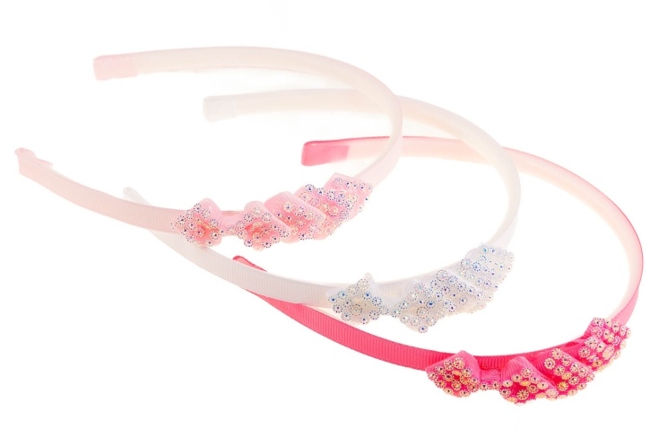 Opaska pokryta materiałem, ozdobiona materiałową kokardką.Zestaw składa się z trzech kolorów: biały, jasny i ciemny różowy.
