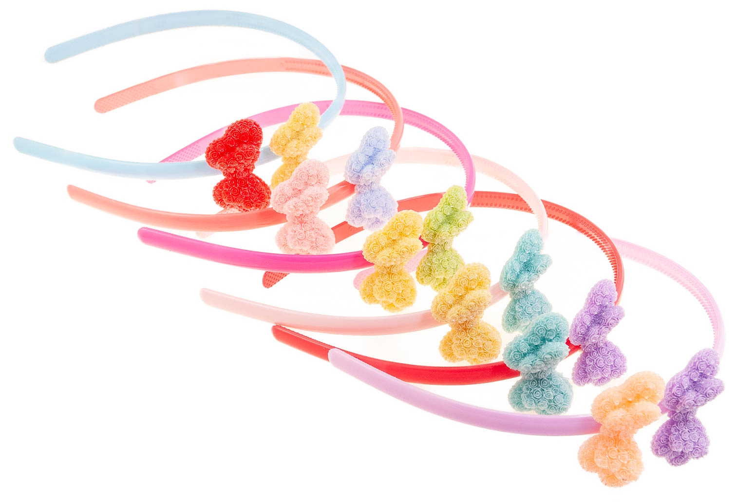 Opaska wykonana z wytrzymałego plastiku, ozdobiona kolorowymi motylkami.Zestaw skłąda się z sześciu kolorów.