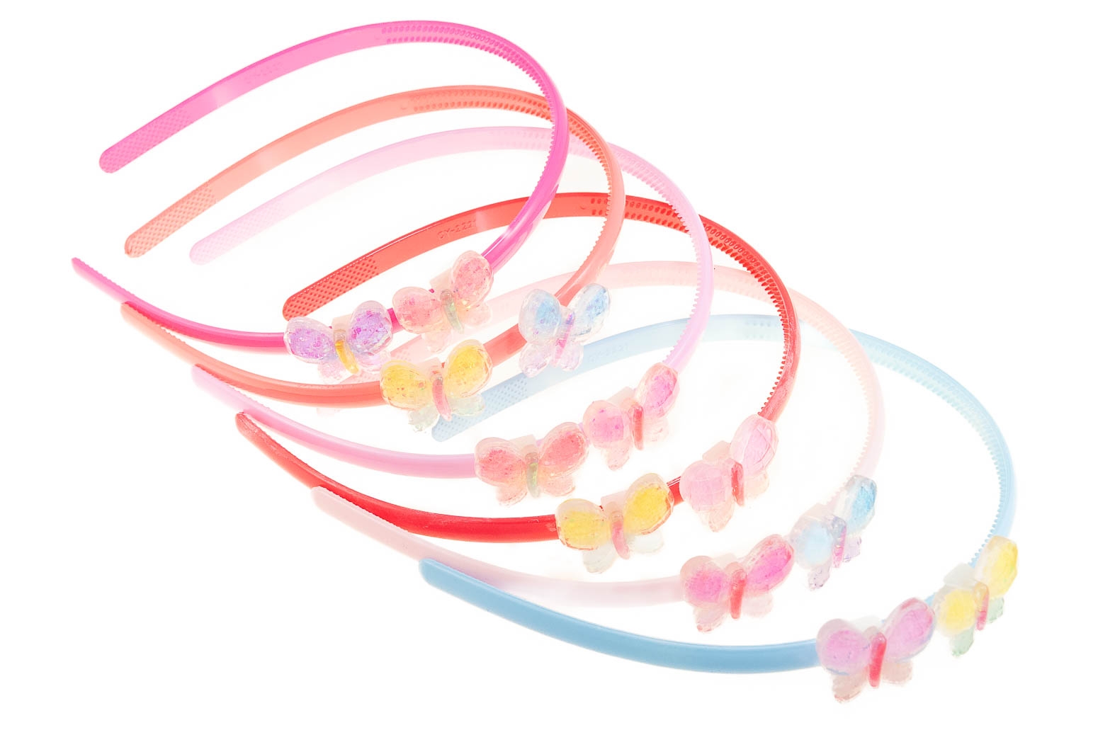 Opaska wykonana z wytrzymałego plastiku, ozdobiona kolorowymi motylkami.