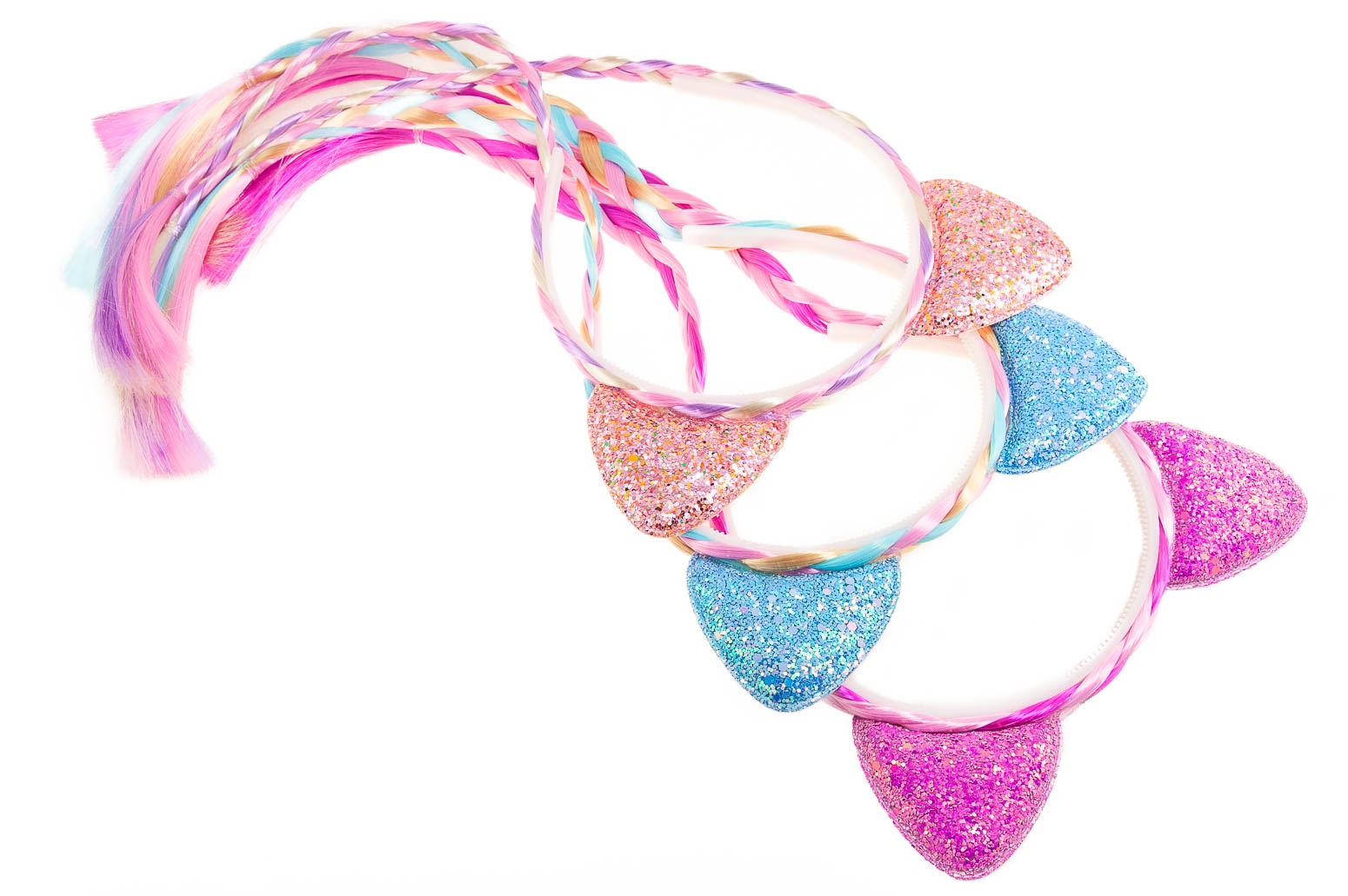 Opaska wykonana z wytrzymałego plastiku, ozdobiona plecionymi, kolorowymi warkoczykami i uszkami.