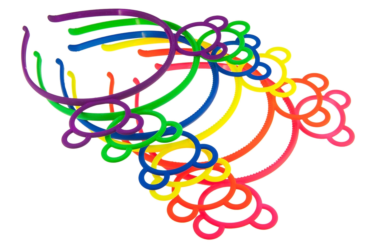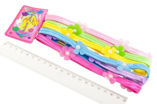 Gładkie opaski w intensywnych kolorach, wykonane z trwałego materiału, posiadają ozdoby w kształcie misiów.