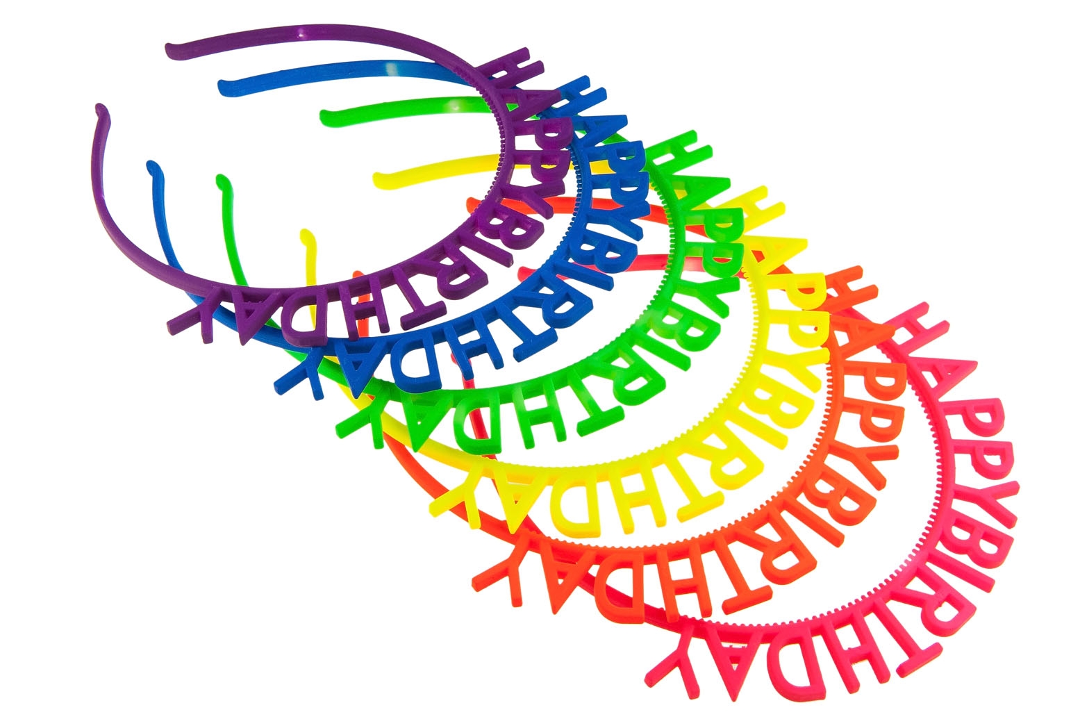 Gładkie opaski w intensywnych kolorach, wykonane z trwałego materiału, z napisem HAPPY BIRTHDAY.
