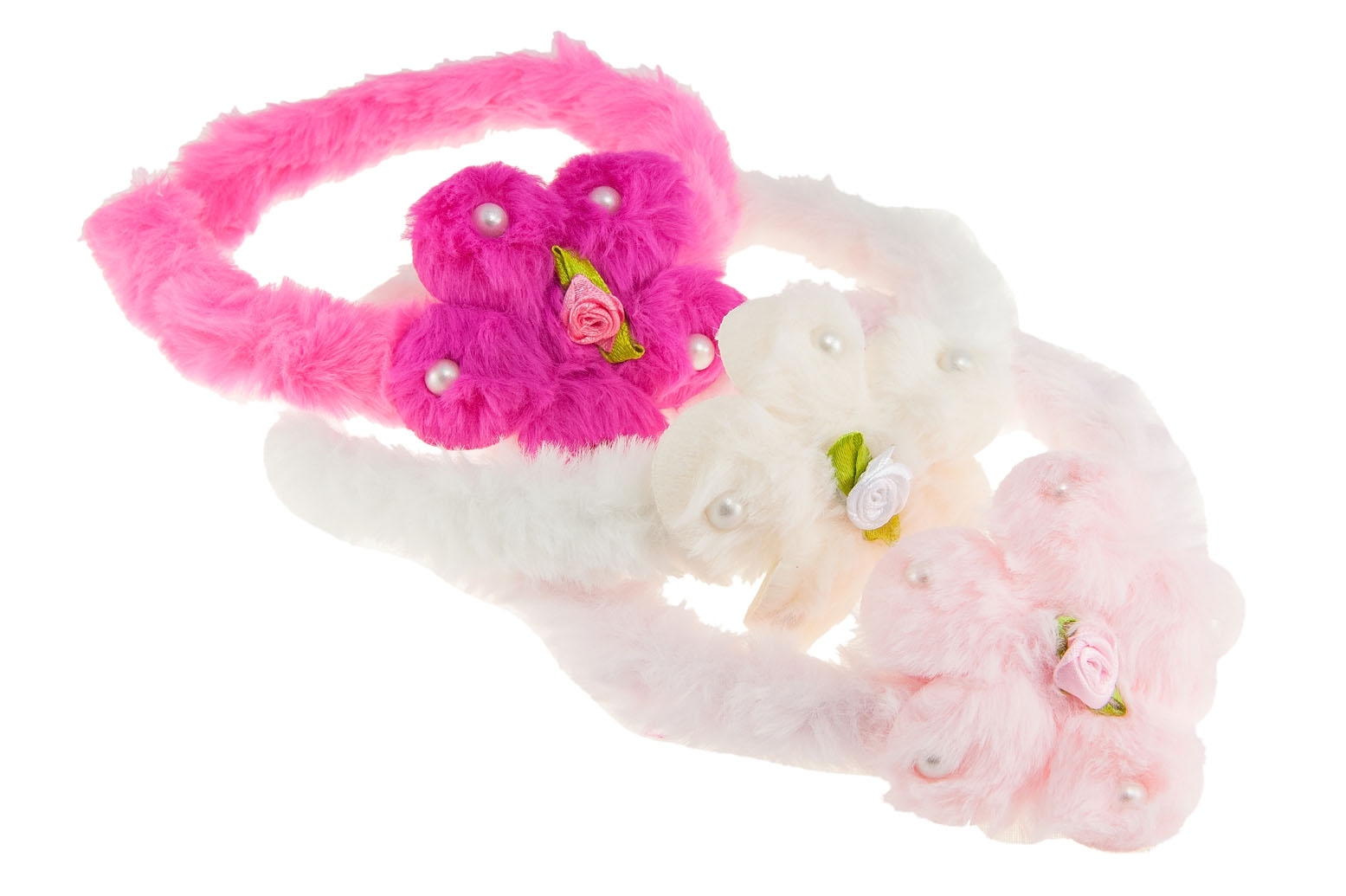 Urocze puchate opaski z kwiatkami ozdobionymi perełkami i różyczką.