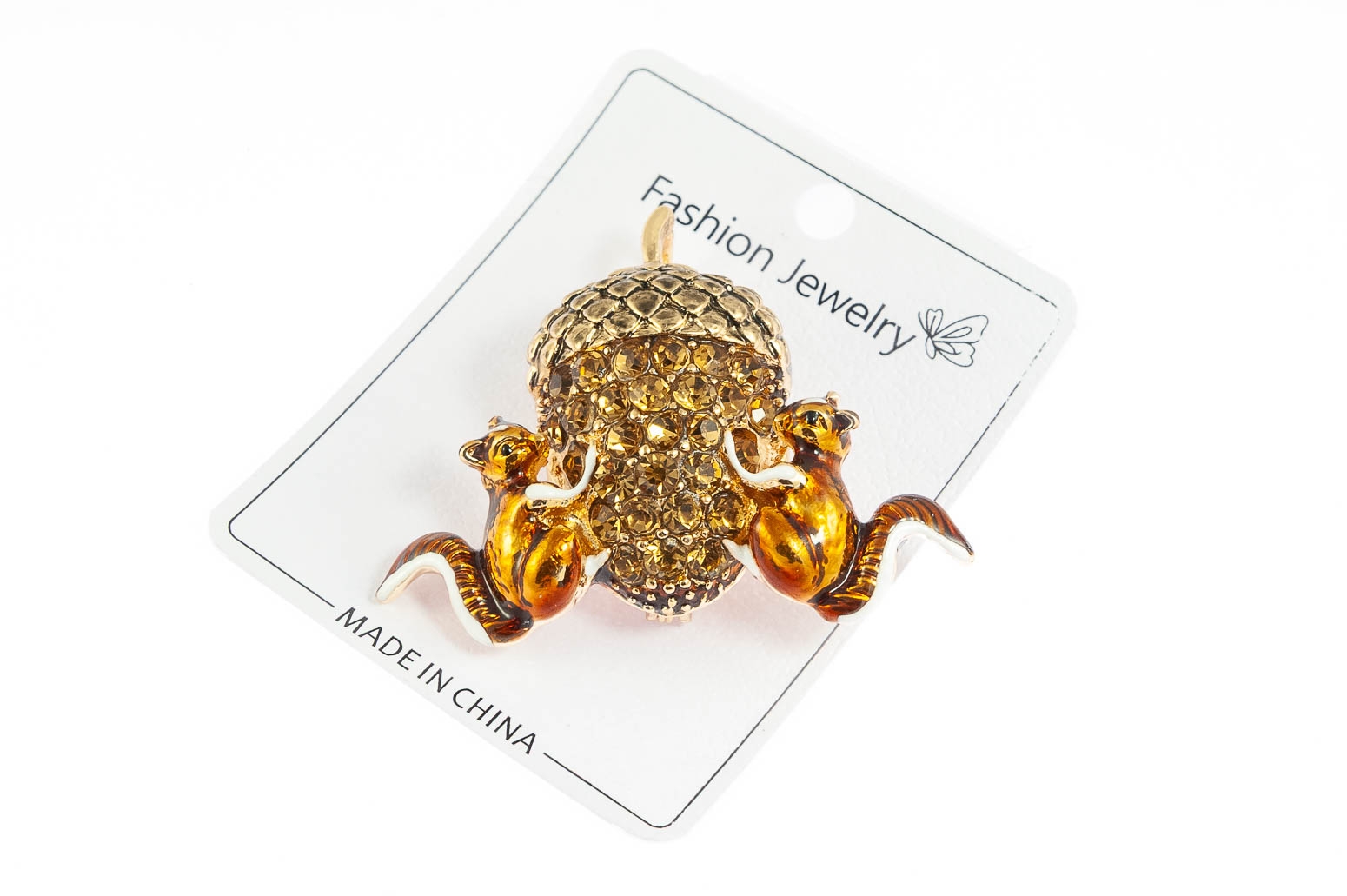Elegancka broszka w kształcie żołędzia z wiewiórkami. Przywieszka w kolorze złotym, ozdobiona szlifowanymi kamieniami i emalią.