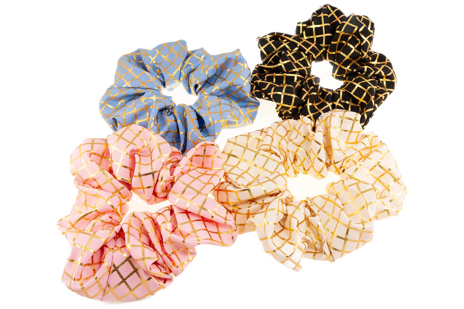 Modna gumka do włosów w kratkę.Zestaw skada się z czterech kolorów: kremowy, różowy, niebieski i czarny.