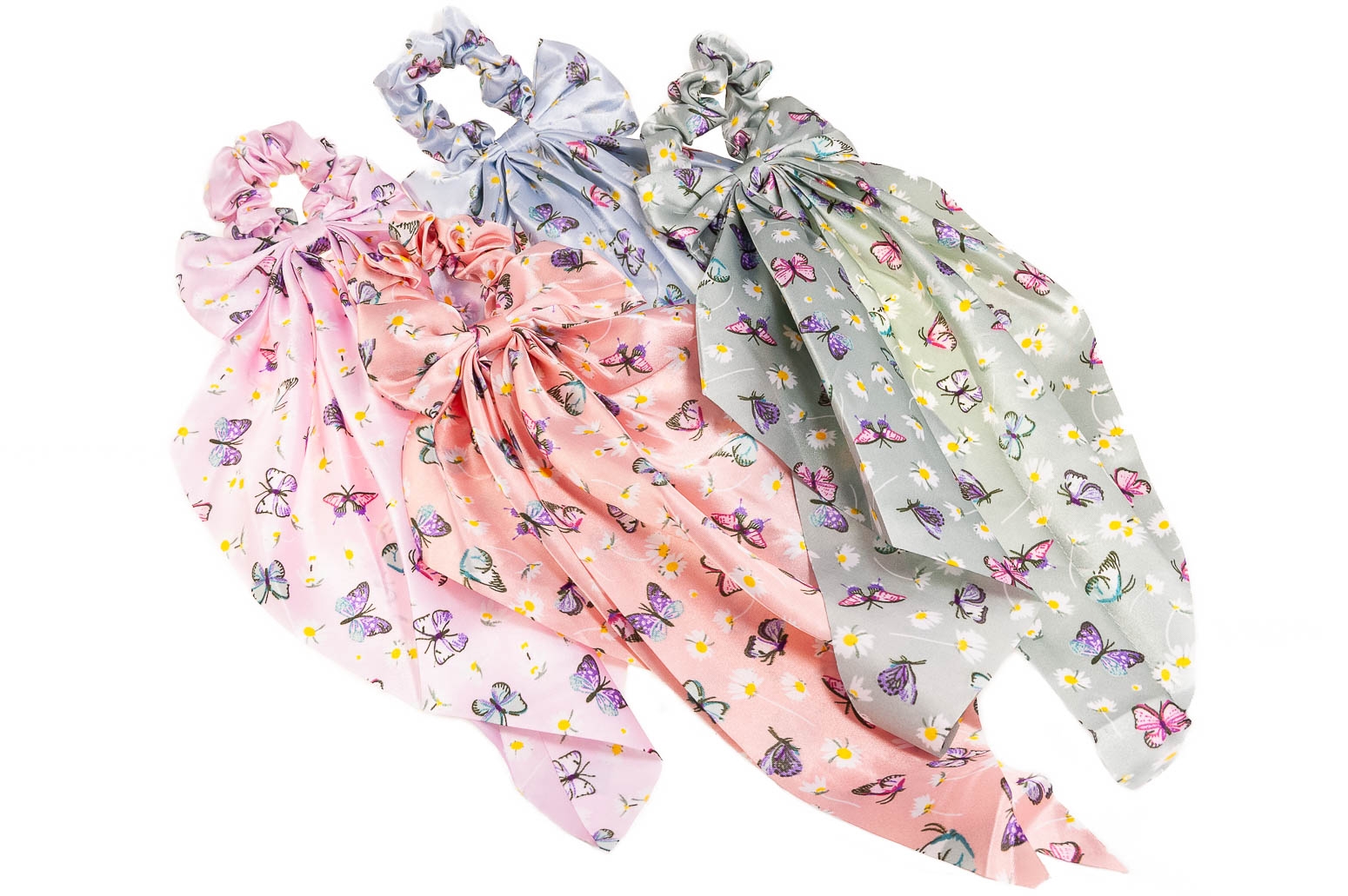 Scrunchie. Gumka z apaszką, wykonana z materiału w motylki.