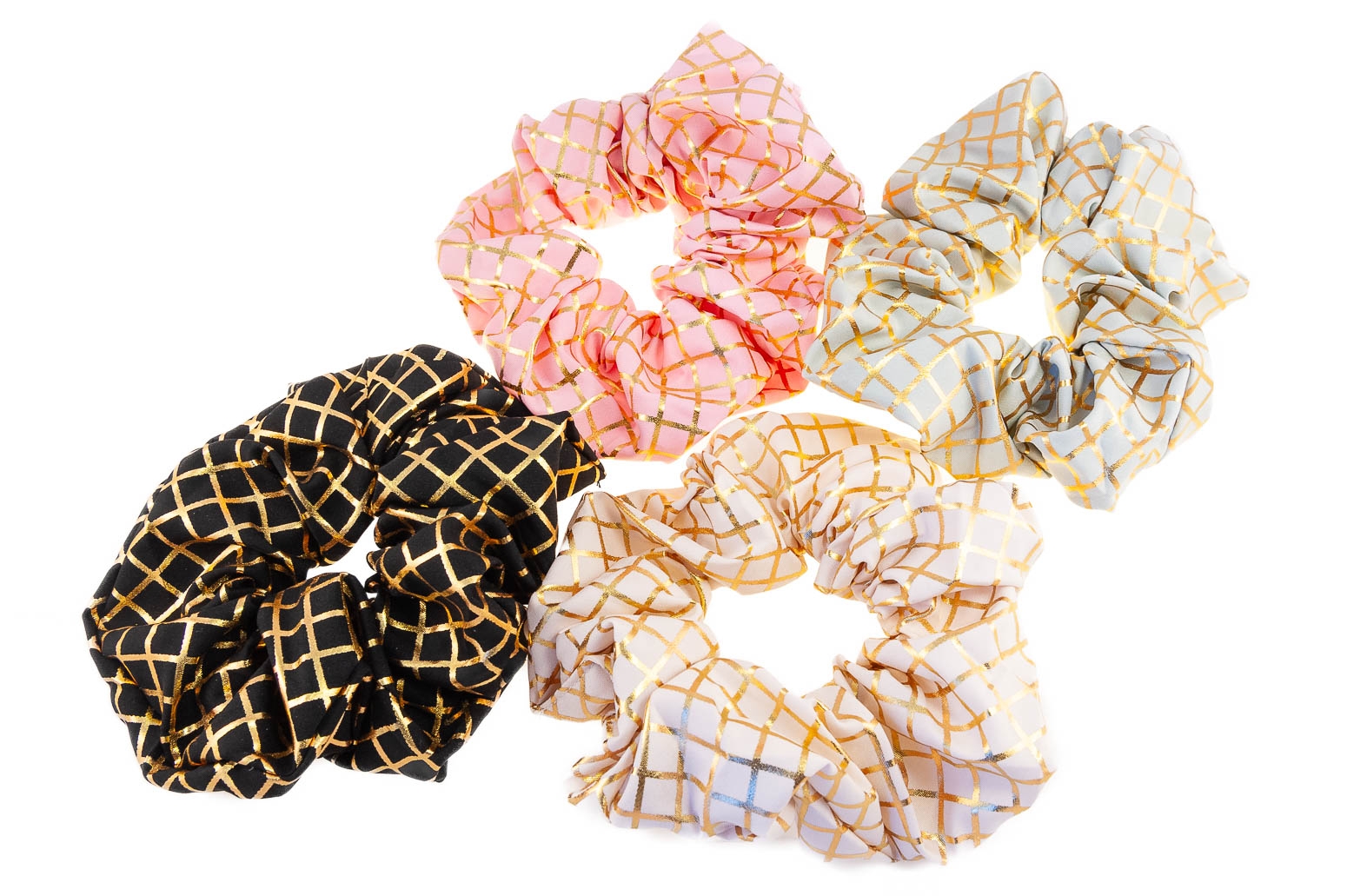 Modna gumka do włosów, ozdobiona złotą kratką.