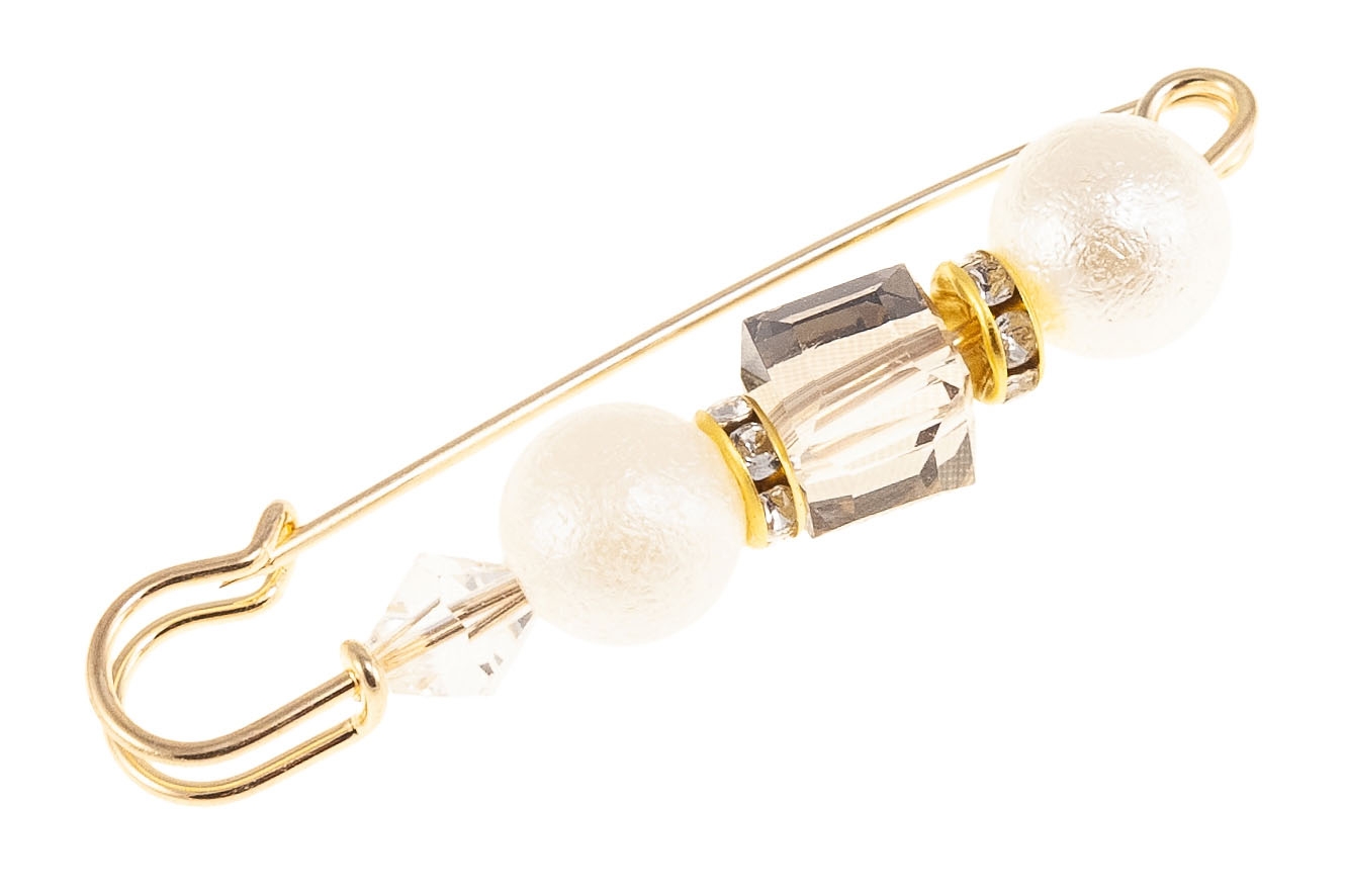 Elegancka broszta w kształcie złotej agrafki. Agrafka ozdobiona pięknymi koralikami i dzetami.