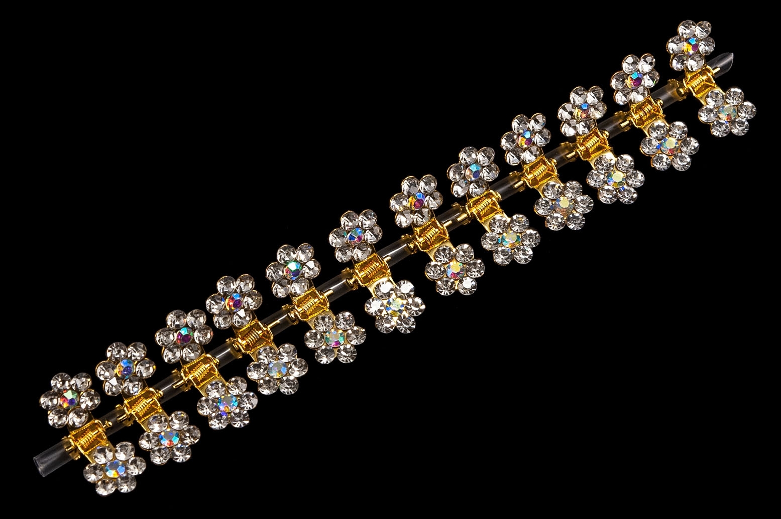 Złote miniszczęki ozdobione dżetowymi kwiatkami.