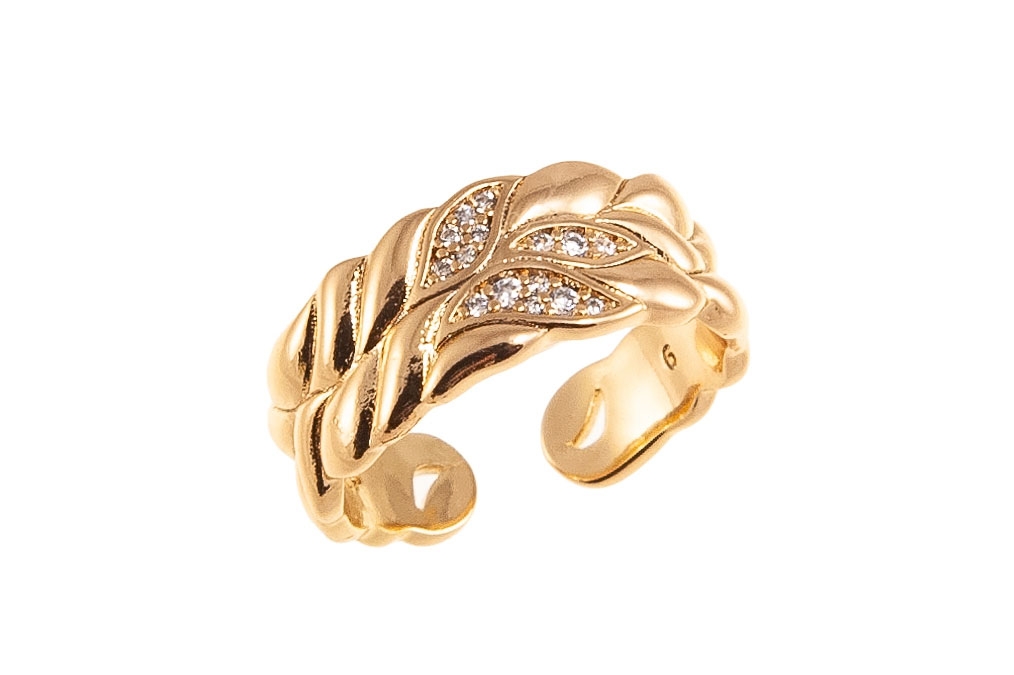 Elegancka złoty pierścionek, ozdobiony szlifowanymi kamieniami.