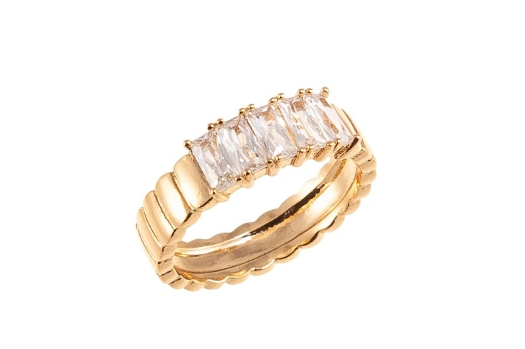 Elegancka złoty pierścionek, ozdobiony szlifowanymi kamieniami.
