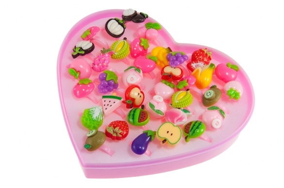 Dziecięce pierścionki wykonany z trwałego materiału. Pierścionki sa wielokolorowe z ozdoba w kształcie owoców.