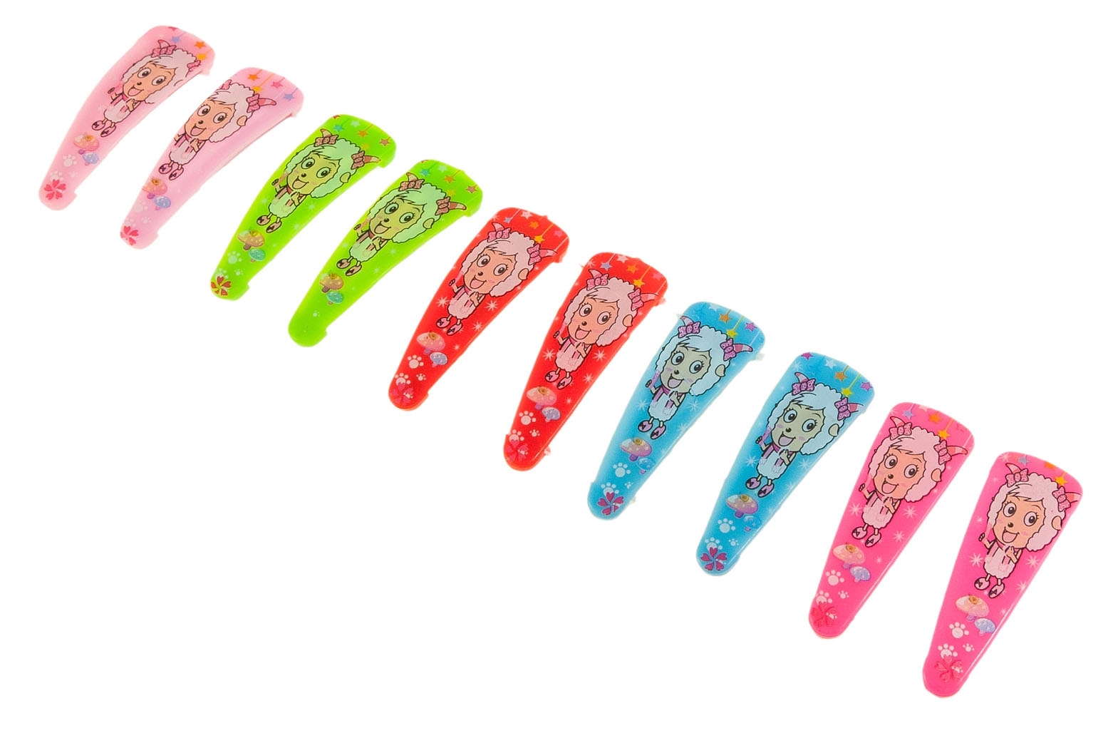 Klasyczne spinki do włosów, wykonane z metalu i plastiku. Spinki są ozdobione nadrukowaną uroczą owieczką.