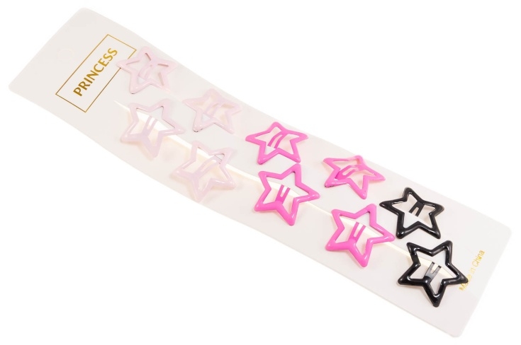 Urocze spinki do włosów w kształcie gwiazdek.Zestaw składa się z trzech kolorów: czarny, jasny i ciemny różowy.