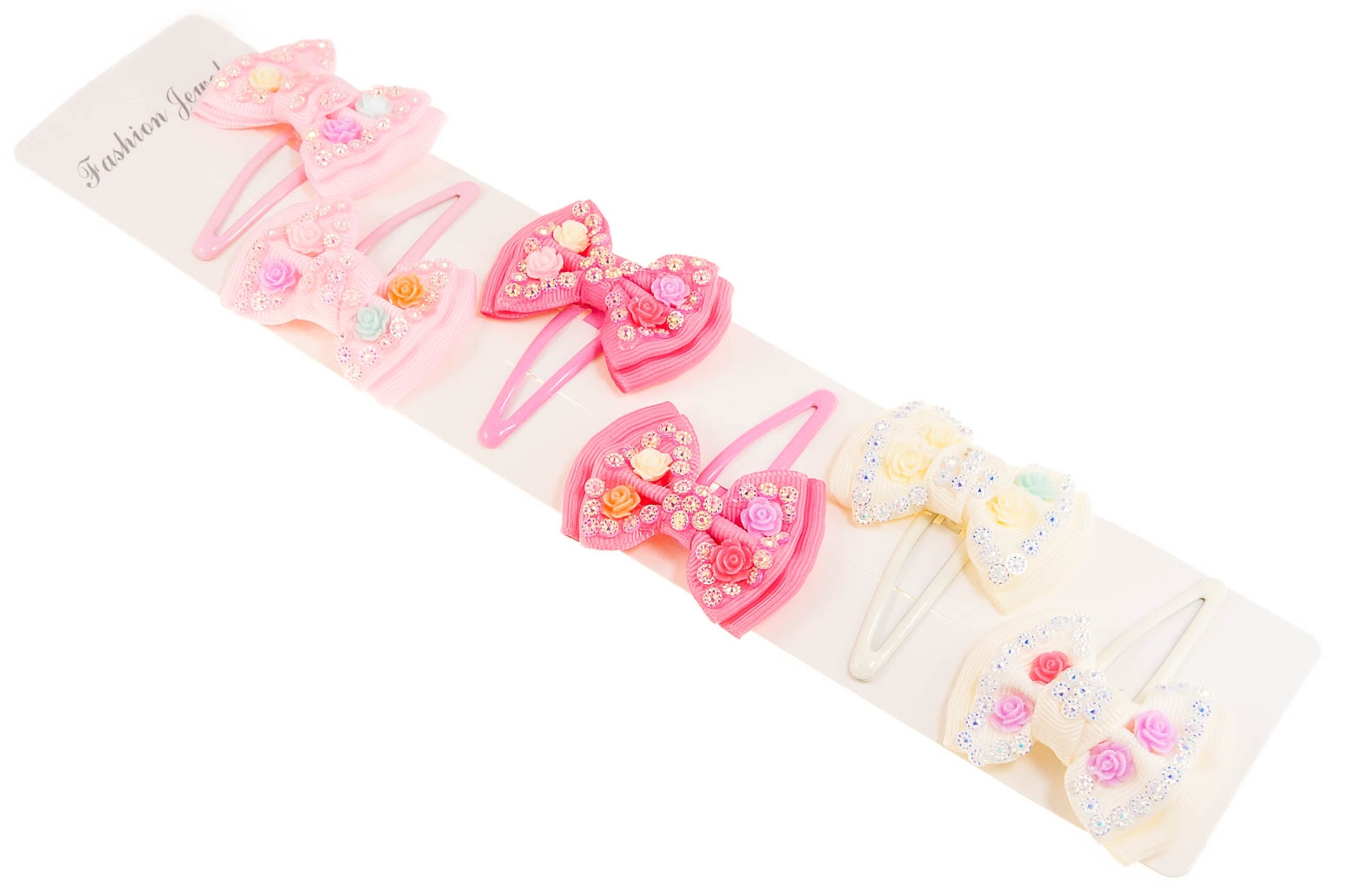 Klasyczne spinki do włosów z uroczą ozdobą w kształcie kokardki.Zestaw składa się z trzech kolorów: biały, jasny i ciemny różowy.