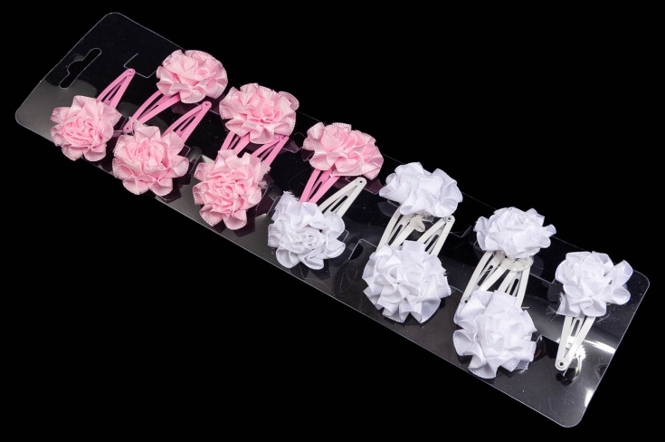Klasyczne spinki do włosów z uroczą ozdobą w kształcie kwiatka.Zestaw składa się z ozdób w białym i różowym kolorze.