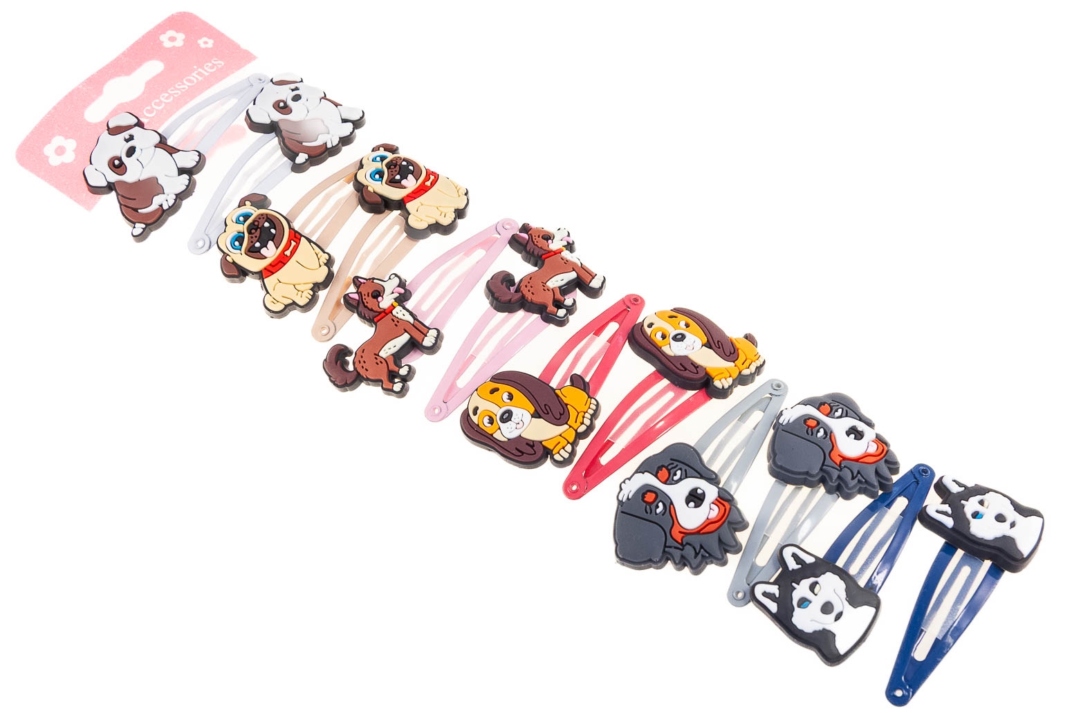 Klasyczne spinki do włosów z uroczymi ozdobami w kształcie piesków.Zestaw składa się z sześciu kolorów.