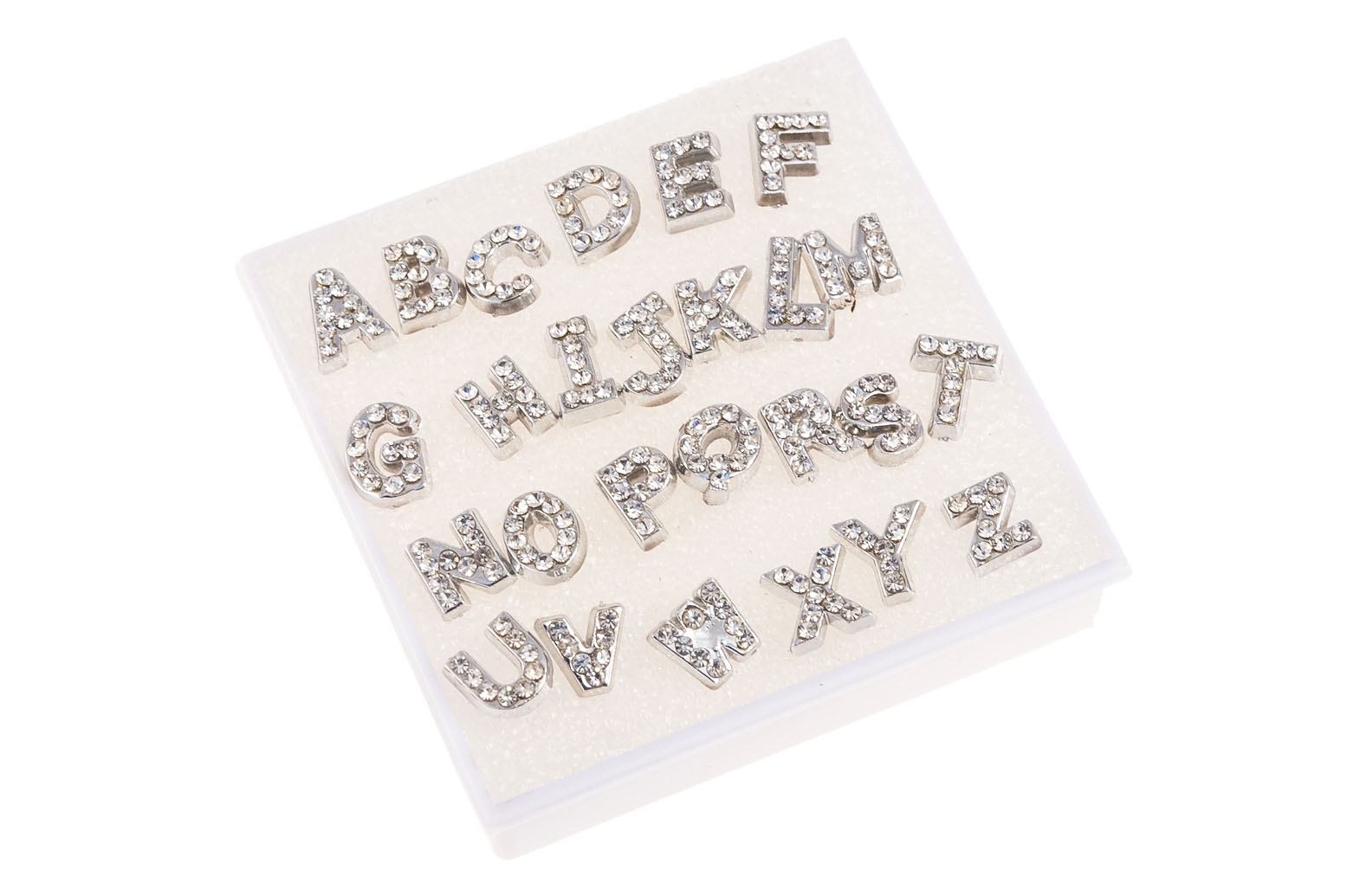 Srebrne kolczyki w kształcie literek, ozdobione szlifowanymi kamieniami.Kolczyki umieszczone w plastikowym pudełeczku.