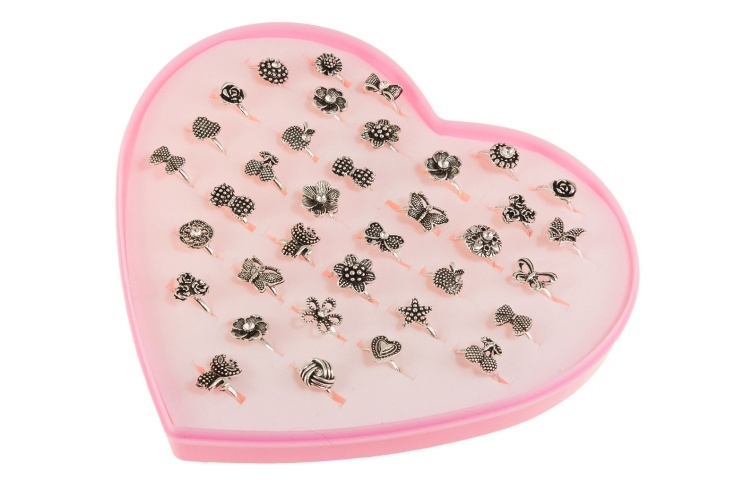 Pierścionki w kolorze srebrnym z uroczymi ozdobami w różnych kształtach.