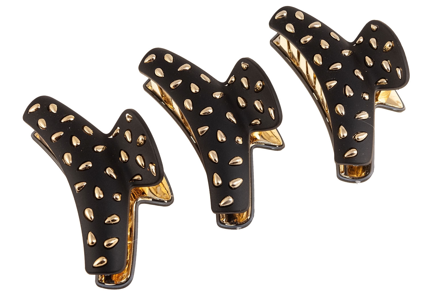 Klasyczne spinki do włosów wykonane z wytrzymałego materiału. Spinki ozdobione są złotymi elementami.