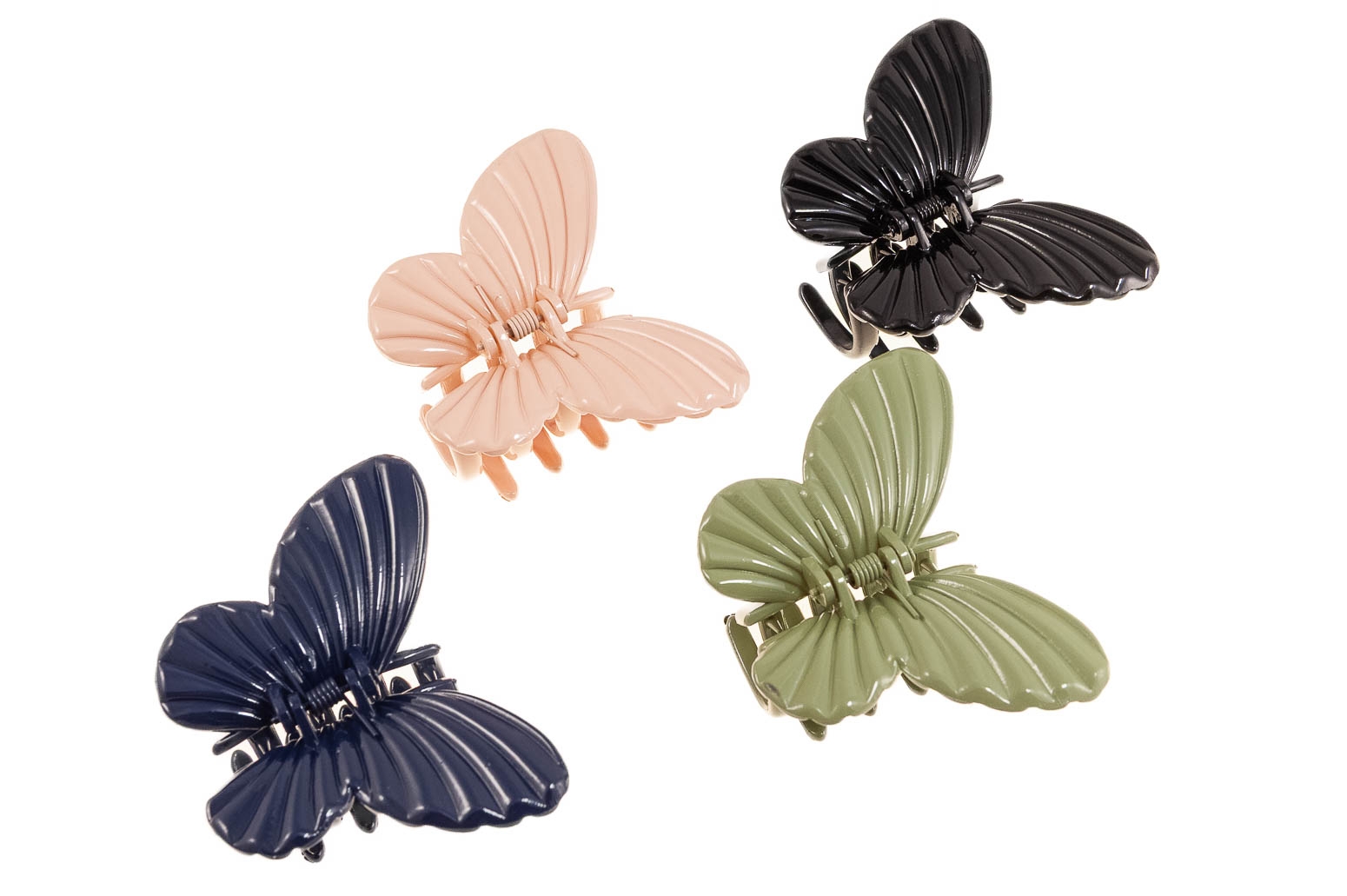 Spinka do włosów w kształcie motylka wykonana z wytrzymałego materiału.Zestaw składa się z czterech kolorów: czarny, granatowy, oliwkowy i beżowy.