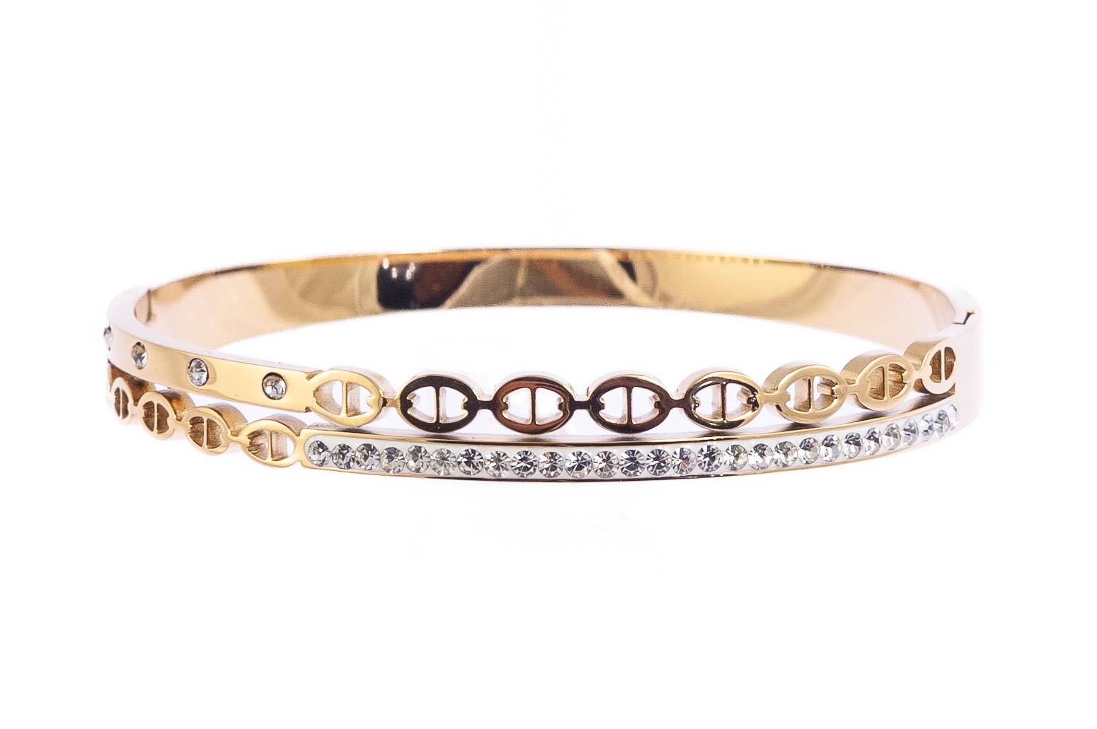 Elegancka, sztywna bransoletka ozdobiona dżetami. Bransoletka jest w kolorze złotym.Wymiary bransoletki:
