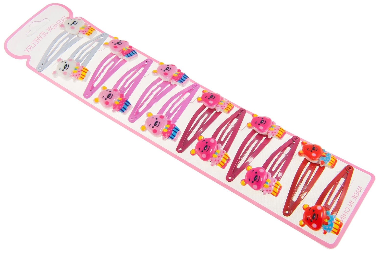 Klasyczne spinki do włosów, wykonane z metalu. Spinki są ozdobiene uroczym misiem.Zestaw składa się z czterech kolorów: biały, czerwony, jasny i ciemny różowy.