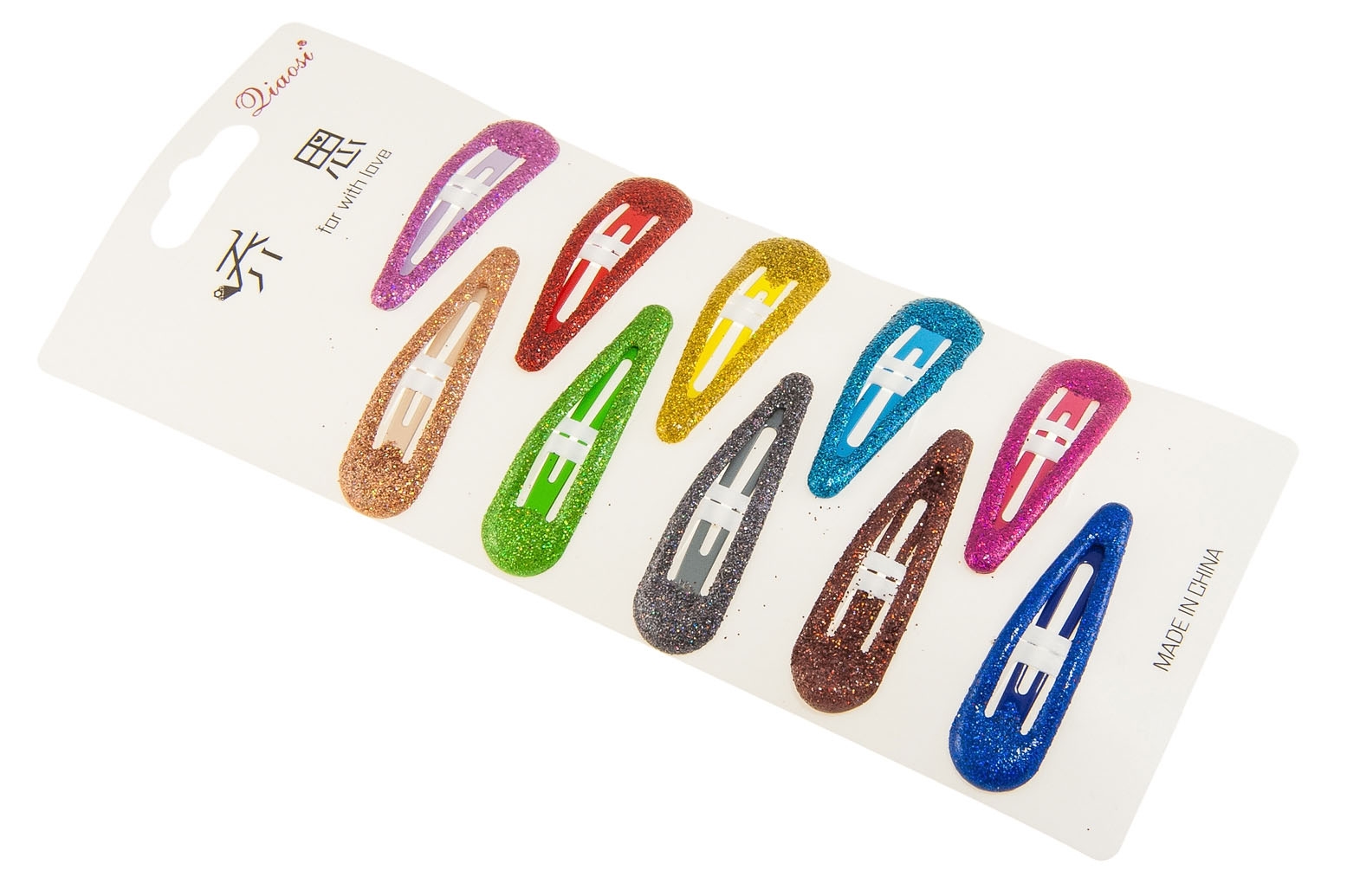 Klasyczne spinki do włosów pokryte brokatową emalią.Zestaw składa się ze spinek w dziesięciu kolorach .