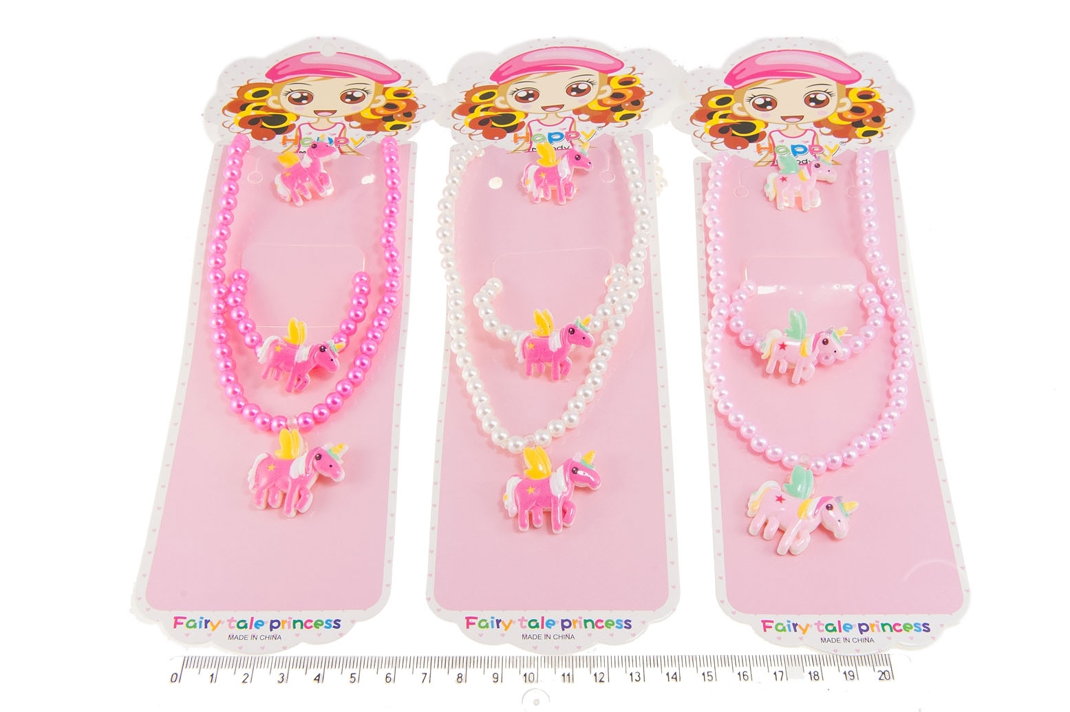 Komplet biżuterii dziecięcej, składający się z naszyjnika, bransoletki i pierścionka.