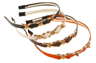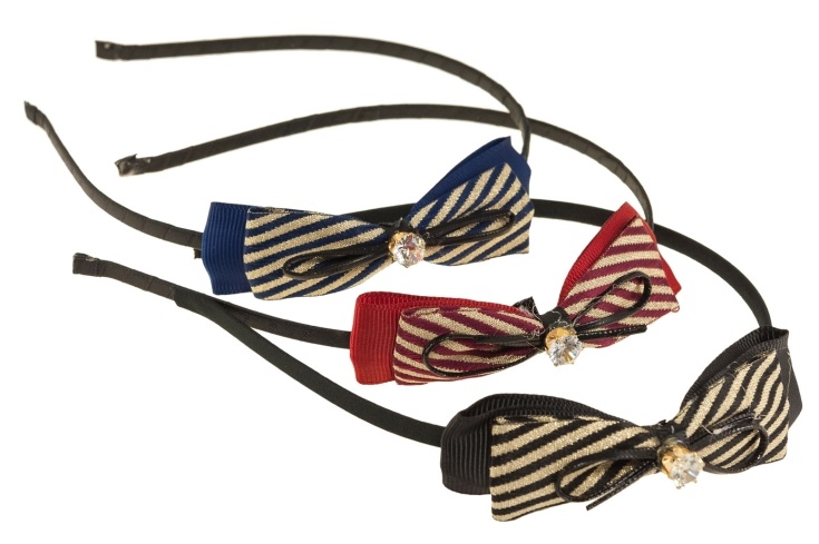 Cienka opaska wykonana z trwałego materiału, ozdobiona kokardą i szlifowanym kamieniem.