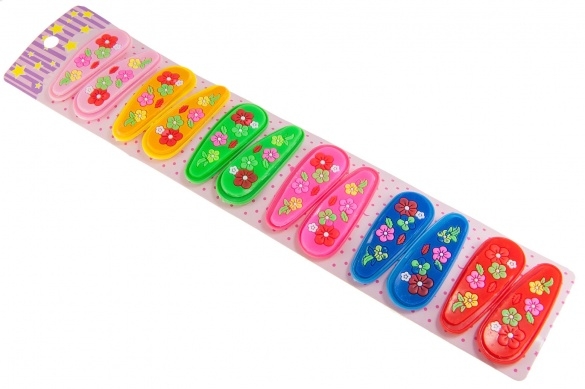 Kolorowe spinki do włosów pokryte gumą, dzięki czemu dobrze trzymają się włosów.