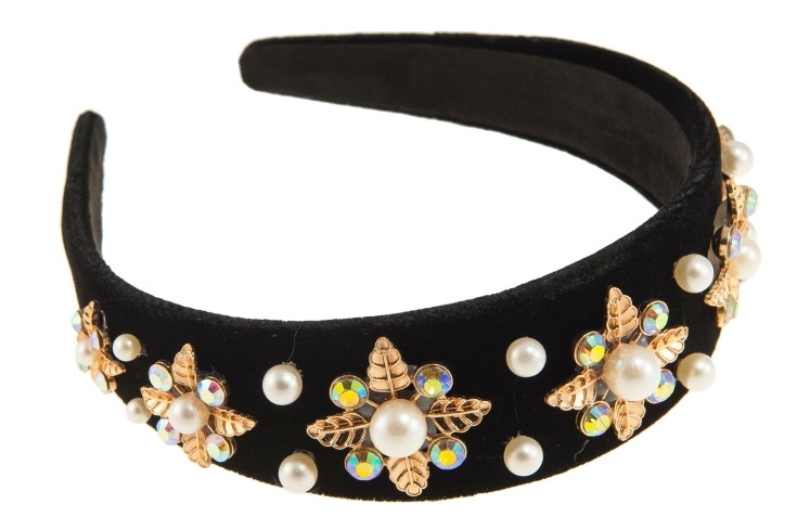 Opaska jest w kolorze czarnym, ozdobiona złotymi elementami i szlifowanymi kamieniami.