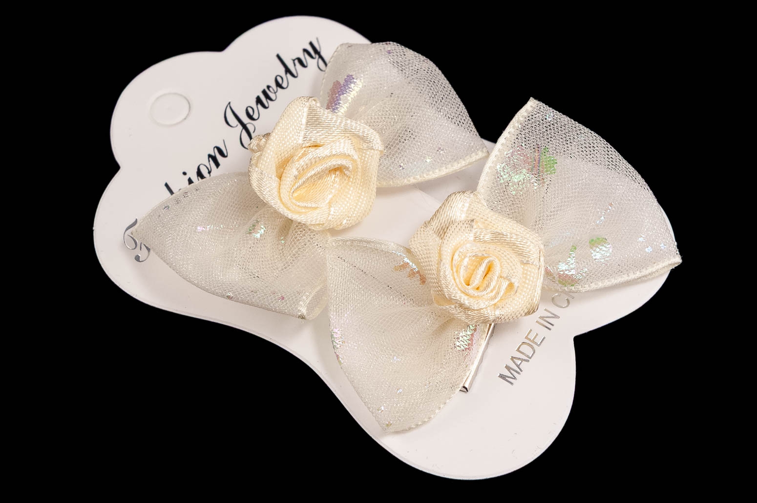 Klasyczne spinki do włosów z uroczą ozdobą w ksztacie kokardki z różyczką.Zestaw składa się ze spinek w beżowym kolorze.