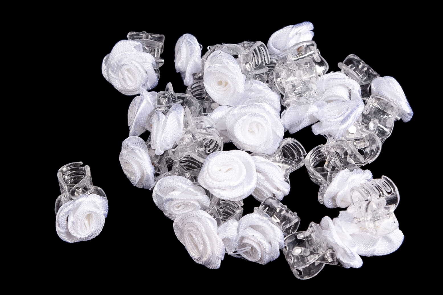 Transparentne miniszczęki ozdobione białą różyczką.Spinki nadadzą fryzurze elegancji i oryginalności.