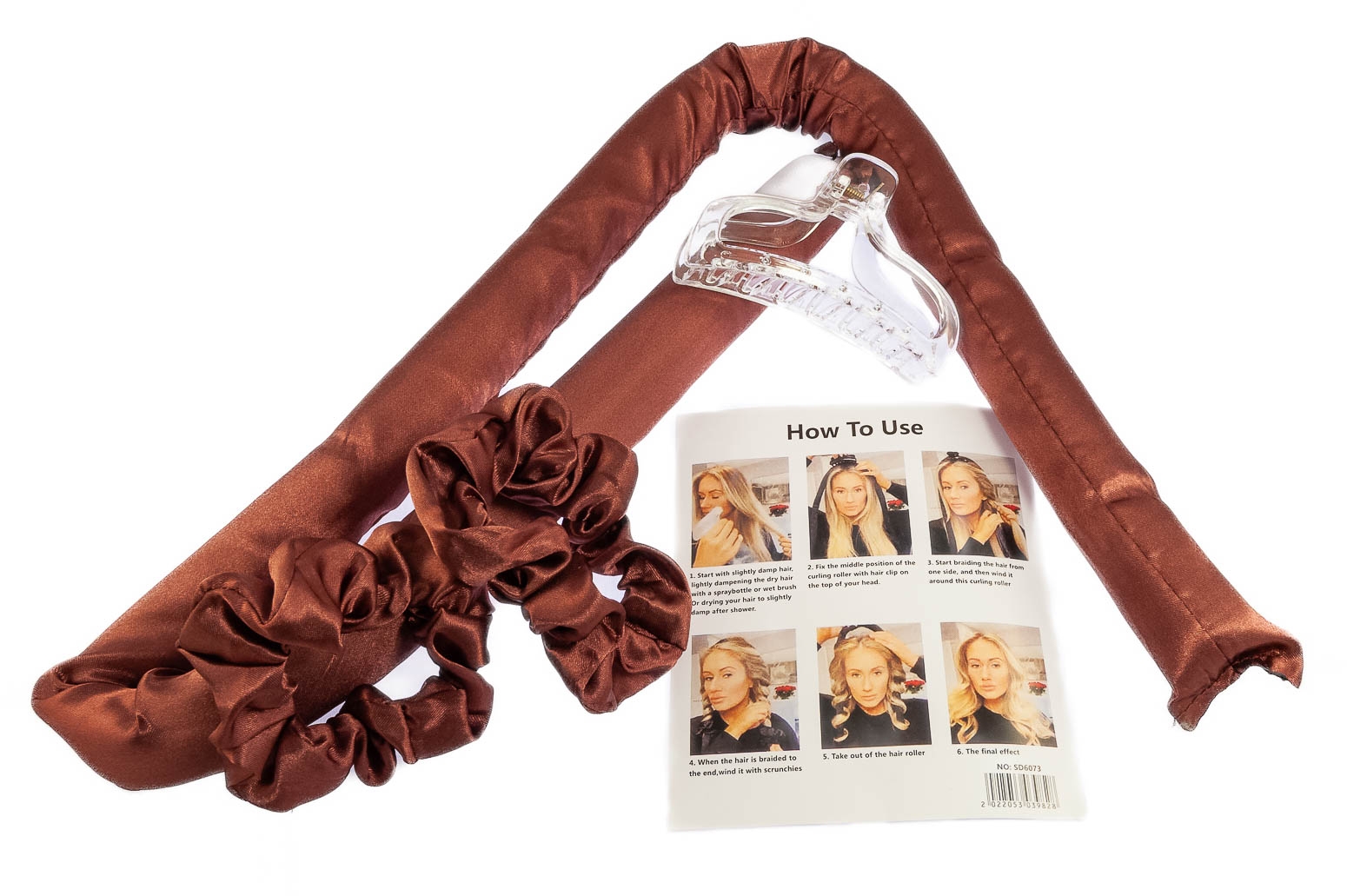 Akcesoria do zakręcenia włosów. Zestaw składa sie z walca, dwóch owijek i szczęki.Przedmiot jest w kolorze brązowym.
