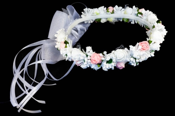 Piękny wianek wykonany z uroczych kwiatków oraz wiszących wstążeczek.