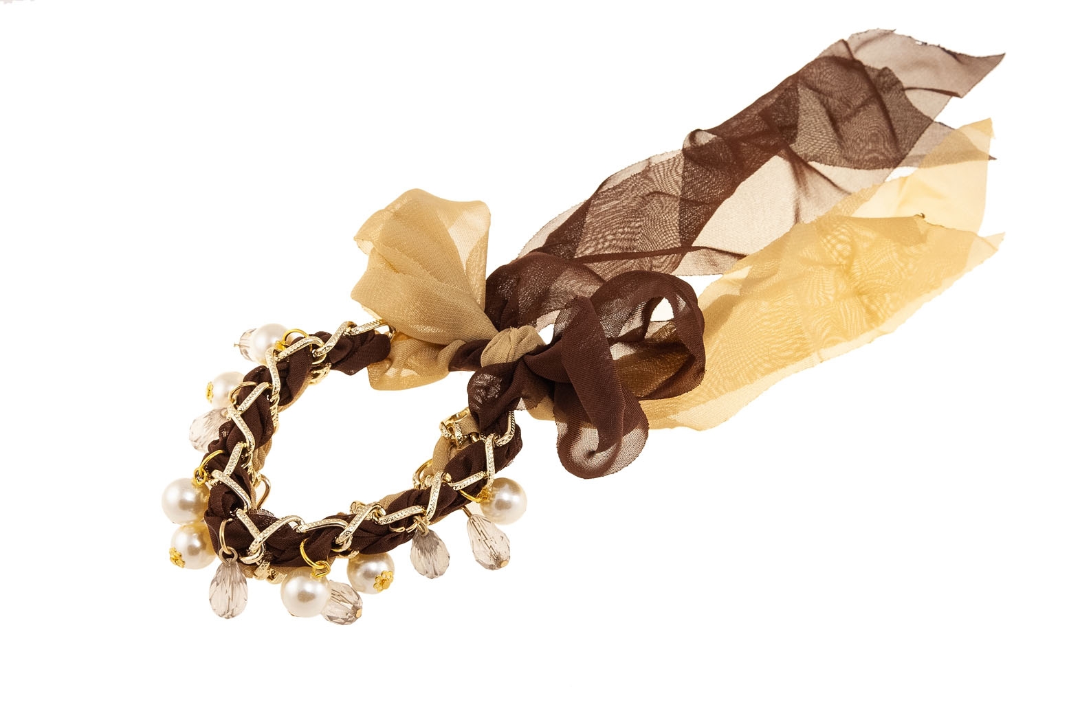 WIązana bransoletka wykonana z brązowej wstążki, złotego łańcuszka, szlifowanych koralików i perełek.Wymiary bransoletki: