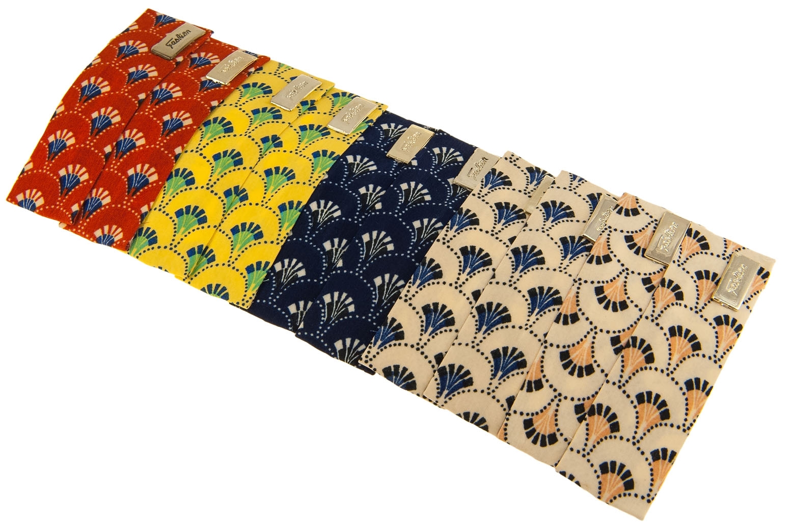 Klasyczne spinki do włosów pokryte wzorzystym materiałem.Zestaw składa się z pięciu kolorów: czerwony, żółty, niebieski, beżowy i granatowy.