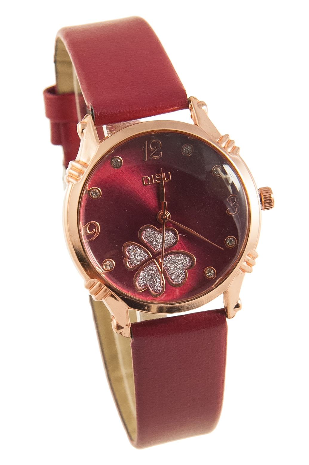 Elegancki zegarek o złotym wykończeniu. Paski zagarka są w kolorze czerwonym.